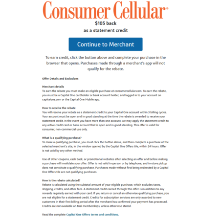 To earn the rebate you must make an eligible purchase at consumercellular.com. To earn the rebate, you must be a Capital One cardholder or bank account holder, and logged in to your account on capitalone.com or the Capital One Mobile app.