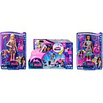 Take your adventures on the road with this Barbie Big City, Big Dreams bundle! The bundle includes Barbie "Malibu" Roberts and Barbie "Brooklyn" Roberts in their signature performance look from Barbie Big City, Big Dreams! Ready for the spotlight? Lift Barbie dolls microphone to her mouth, music will play, her dress will light up, and she'll sing along to one of two original songs! Imaginations can hit the road and play out rockin' adventures with the transforming Barbie vehicle playset. The glittery pink SUV features a removeable roof that becomes a stage and removeable seats that become seating for an audience. Includes over 20 storytelling accessories including a drum set and stool, speaker and turntable, microphones and more!