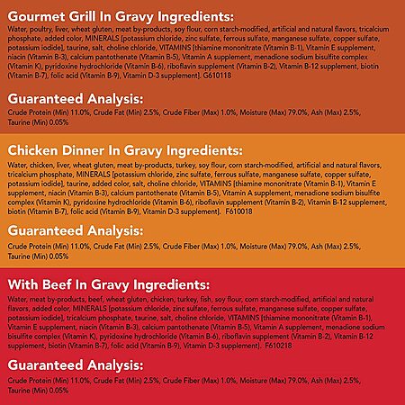 Ingredients: Water Sufficient For Processing, Meat By-products, Beef, Wheat Gluten, Chicken, Turkey, Fish, Soy Flour, Corn Starch-modified, Artificial And Natural Flavors, Added Color, Potassium Chloride, Zinc Sulfate, Ferrous Sulfate, Manganese Sulfate, Copper Sulfate, Potassium Iodide, Tricalcium Phosphate, Taurine, Salt, Choline Chloride, Thiamine Mononitrate (vitamin B-1), Vitamin E Supplement, Niacin (vitamin B-3), Calcium Pantothenate (vitamin B-5), Vitamin A Supplement, Menadione Sodium Bisulfite Complex (vitamin K), Pyridoxine Hydrochloride (vitamin B-6), Riboflavin Supplement (vitamin B-2), Vitamin B-12 Supplement, Biotin (vitamin B-7), Folic Acid (vitamin B-9), Vitamin D-3 Supplement,