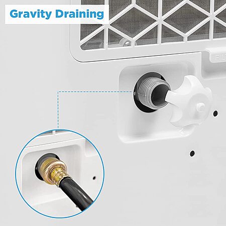 • The Auto-Drain Pump easily drains vertically or horizontally into a sink or out of a window (16 feet drain tube included). The bucket never needs emptying again. Equipped with bucket full indicator and auto shutoff function for added convenience.