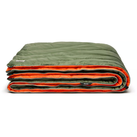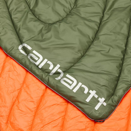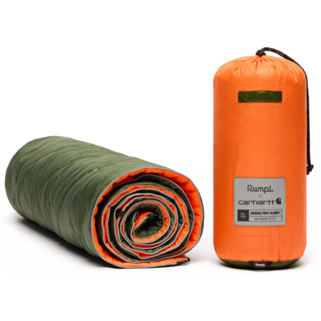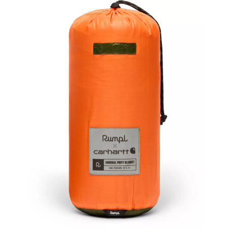 Rumpl & Carhartt collab packable puffy blankets. 3 colorways. : cypress/orange, black/lime & camo/black