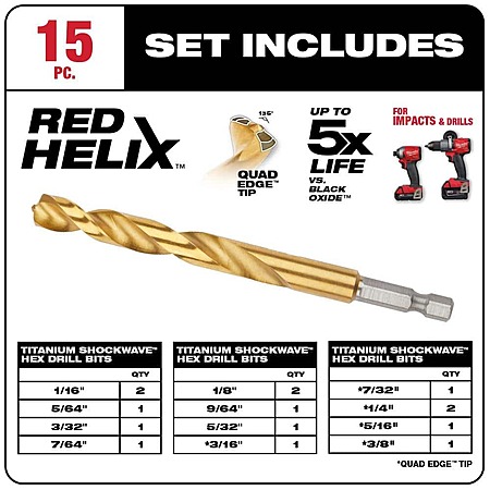 15-Piece Milwaukee Shockwave Impact-Duty Titanium Drill Bit Set (48-89-4630) for