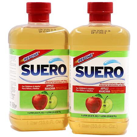 Amazon.com[amazon.com] has 2-Pack 33.8-Oz REPONE SUERO Electrolyte Solution w/ Zinc (Apple Flavor) for $3.37. Shipping is free w/ Amazon Prime or on $25+.