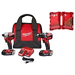 - Includes: one 2801-20 drill driver, one 2850-20 impact driver, two 48-11-1820 M18 REDLITHIUM 2.0 compact batteries, one 48-59-1812 M18-M12 multi-voltage charger, 1 carrying case and one 48-89-4630 SHOCKWAVE Impact Duty titanium drill bit set (15-piece)
