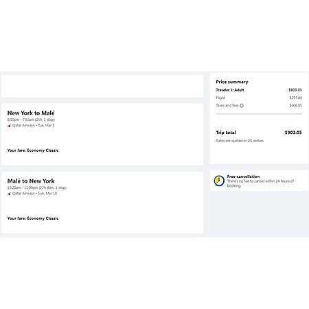 Skytrax rated 5 out of 5 stars for Worlds Best Airline, Qatar Airways via Travelocity have round trip airfares travelling from New York (JFK) to Maldives (MLE) for $904, making 1 stop in Doha for up to 9 hours so plan ahead. These are economy classic airfares that include a personal item, a carry-on bag and 2 free checked bags.