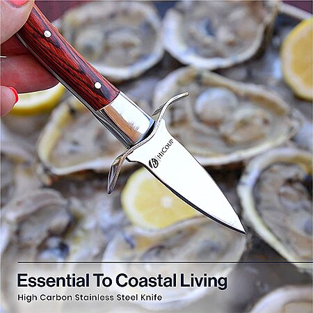 Model: HiCoup Oyster Shucking Knife and Glove Kit - Clam and Oyster Knife Shucker Set with Stainless Steel Seafood Opener Tool, Wood Handle and Gloves