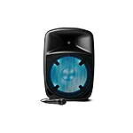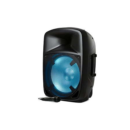 Pro Glow 1500 has everything you need in an all-in-one speaker system: A high-powered (250-watt) bi-amplified equalized sound system driving a 15-inch woofer and 1-inch tweeter covers even the largest spaces with clear vibrant sound. The woofer glows in multiple colors for exciting visual effects. The speaker has a multi-channel mixer with two mic inputs and Master Volume control plus remote control. You can wirelessly stream music from any Bluetooth® device use the built-in music player to read music files using the USB port or SD card slot or take advantage of the on-board FM radio. The included microphone with echo effect is great for karaoke. Pro Glow 15 has side handles a top handle and built-in wheels for easy transport and a universal pole-mount insert for versatile placement.