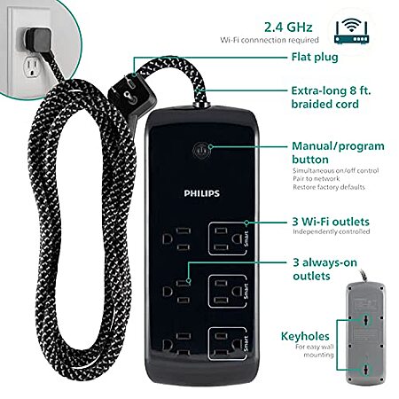 • 3 always-on outlets provide continuous power to household electronics while 3 smart outlets offer independent mobile operation. The easy-to-use Philips Smart Select app, available in the Apple App Store and on Google Play, features unique control options.