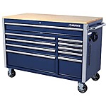 Husky 52 in. W x 24.5 in. D Standard Duty 10-Drawer Mobile Workbench Tool Chest with Solid Wood Work Top in Gloss Blue with Silver Trim $399