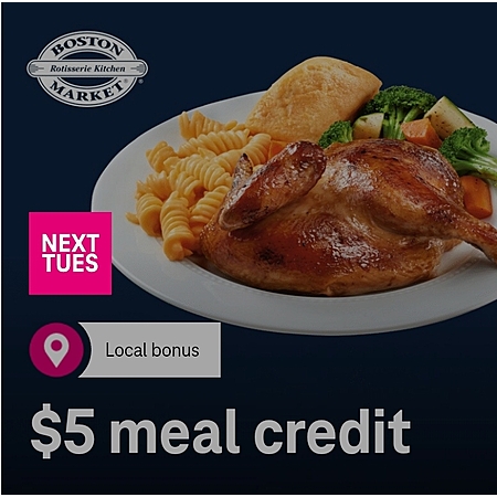 Check back next week to put a $5 credit toward any purchase at Boston Market! Available for dine-in, carryout or drive thru.