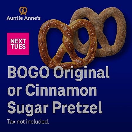 Check back next week to buy one Auntie Anne's Original or Cinnamon Sugar Pretzel and get one free. Tax not included.