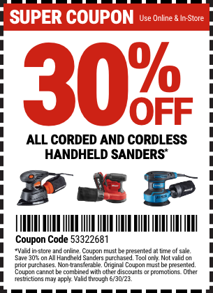 Harbor Freight, 30% off all corded and cordless handheld sanders and oscillating multi tools with coupon