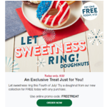 Got an email today from Krispy Kreme saying that I could get a free donut with any purchase if you use code FREETREAT I'm not sure what the cheapest thing to purchase at Krispy Kreme is.