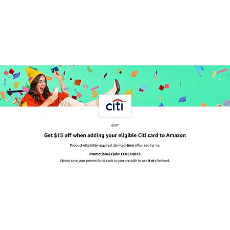 Amazon is offering Select Amazon Accounts: $15 Off When You Add An Eligible Citi Card to your Amazon Wallet and apply promotional code CITICARD15 (apply at checkout) w/ $15.01 or more products (sold/shipped) by Amazon only.
