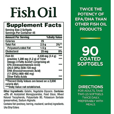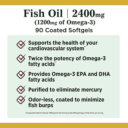 Product Description from Store- FOR YOUR HEART 90-count; 2400mg; 1200mg of Omega-3; Fish Oil Softgels