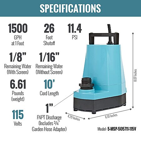• 1/6 HP, 1500 GPH, 115-Volt, 25-foot cord, manual operation, 2.0 running Amps, 220 Watts, 26-foot shut-off, 11.43 PSI