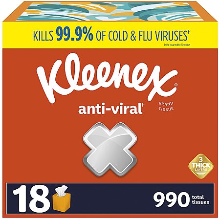 Amazon has 18-Pack 55-Count Kleenex Anti-Viral 3-Ply Facial Tissues on sale for $26.07 - 5% Subscribe & Save - Extra 20% Off coupon found on product page = $19.56. Shipping is free w/ Subscribe & Save or w/ Amazon Prime/or on orders $25+, otherwise, shipping charges will start at $5.99.