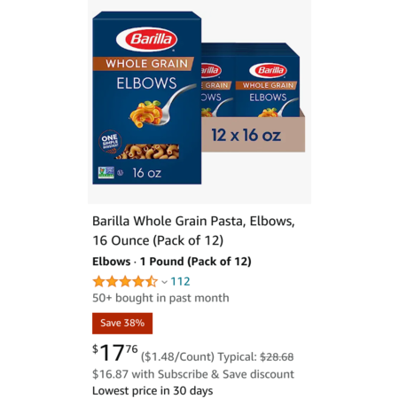 Amazon has 12-Pack 16-Oz Barilla Whole Grain Elbows Pasta for $17.76 - 5% when you check out via Subscribe & Save = $16.87. Shipping is free w/ Prime or on $25+.