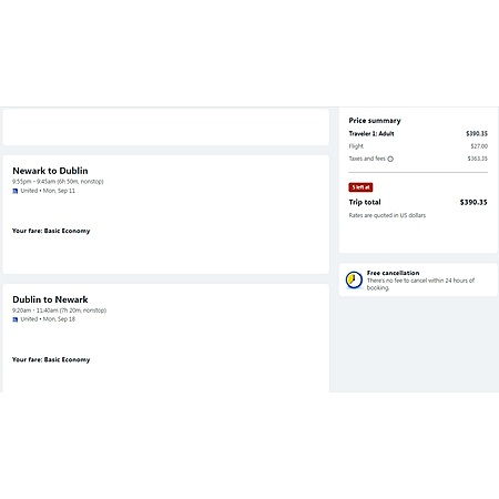 United Airlines and Travelocity have round trip airfares travelling from New Jersey (EWR) to Dublin Ireland (DUB) for $413, nonstop. These are basic economy fares, a restricted-type fare that allows a personal item and a carry-on bag. There is no seat selection and no change. If you are travelling with children, you will be seated together on this fare type.