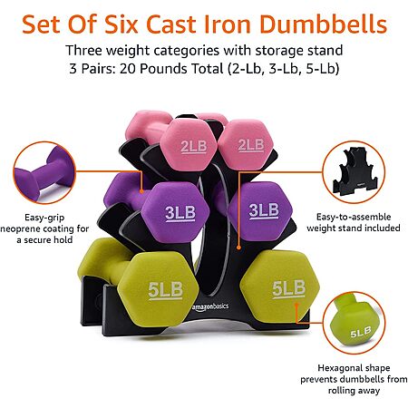 Model: Amazon Basics Neoprene Hexagon Workout Dumbbell Color-Coded Hand Weight - Set of 6 (2, 3, and 5 Pound Weights) with Storage Rack