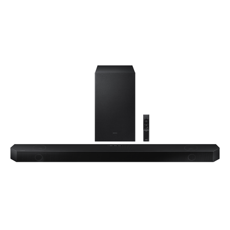 • Q-Symphony: Perfectly synchronized audio uses every speaker in compatible Samsung TV and soundbars.