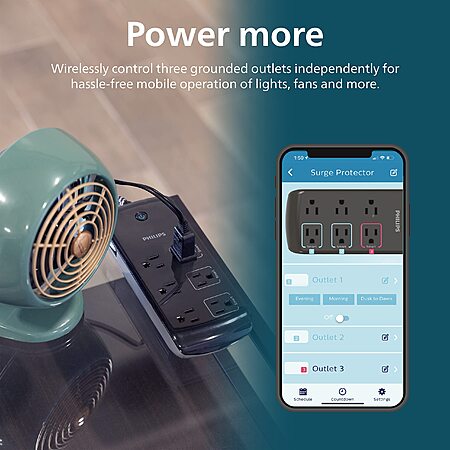 • 3 always-on outlets provide continuous power to household electronics while 3 smart outlets offer independent mobile operation. The easy-to-use Philips Smart Select app, available in the Apple App Store and on Google Play, features unique control options.