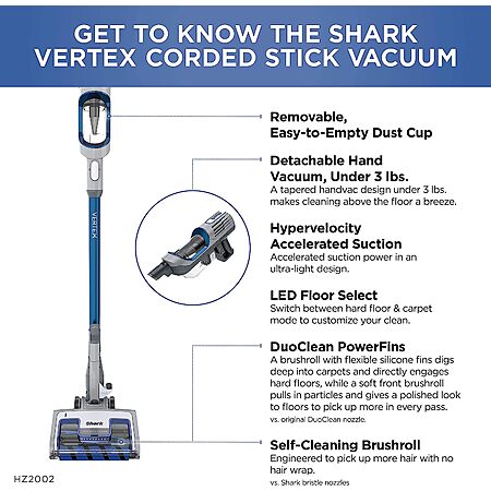 Model: Shark HZ2002 Vertex Ultralight Corded Stick DuoClean PowerFins & Self-Cleaning Brushroll, Perfect for Pets, Removable Hand Vacuum, Upholstery Tool, Dusting & Power Brushes, Cobalt Blue