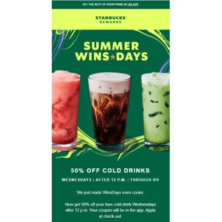 WinsDays just got even cooler for Starbucks Rewards members. Now enjoy 50% off a cold drink on Wednesdays after 12 p.m.