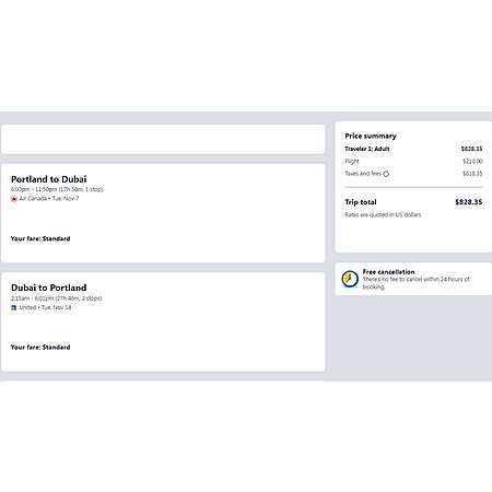 Air Canada & United Airlines via Travelocity have round trip airfares travelling from Portland OR (PDX) to Dubai (DXB) for $829. Flight on Air Canada will make 1 stop while flight on United Airlines may make 1 to 2 stops, depending on what you choose. These are regular economy fares where it will include seat selection, a personal item, a carry-on bag, 1 free checked bag and free change (fare difference applies).