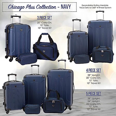 Amazon[amazon.com] has select 5-Piece Travelers Club Chicago Hardside Expandable Spinner Luggage Set (28", 24", 20", Tote, & Accessory Kit) on sale from $143.83. Shipping is free.