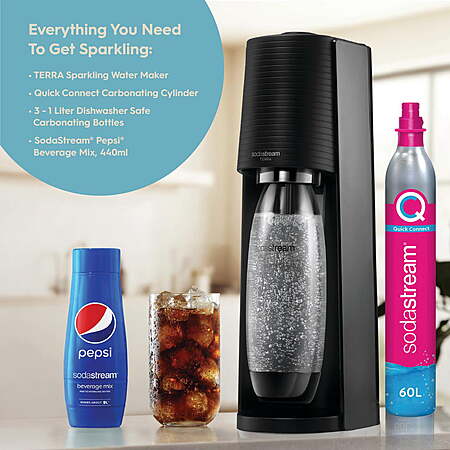 SodaStream Terra Bundle w/ Co2 Cylinder, 3 Bottles & Pepsi Soda Mix (Black or White) from $85.80 + Free Shipping