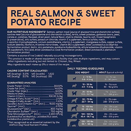 Features:- Real food ingredients for the taste your dog will love. Crafted with real salmon as the first ingredient, paired with whole ingredients like manhaden fish meal, peas and sweet potatoes