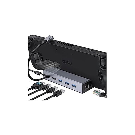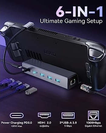 • 6-In-1 Steam Deck Docking Station: Integrated with an HDMI 2.0 output (4K@60Hz), three USB-A 3.0 ports (each 5Gbps), one hyper speed(1Gbps) Ethernet input, and a USB-C PD3.0 port (100W) for charging, allowing you to get the best gaming experience out of your steam deck and other consoles.