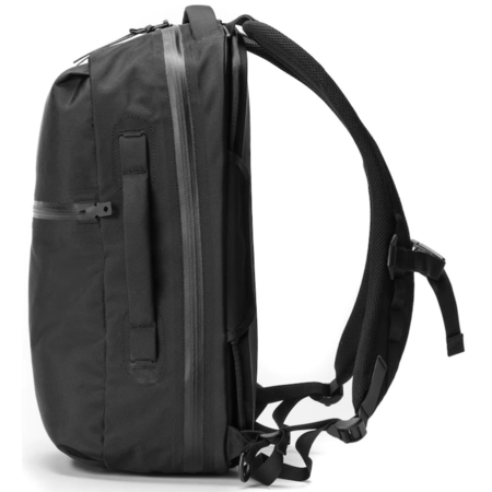 Black Embers backpack straps fold into the back wall of the bag so fully turn into a side held brief case that looks the part. It's pretty common on a lot of their business oriented backpacks - including their top briefcase "Forge". A few other companies do this too... I think the generic term for this is "convertible backpack" or "convertible briefcase". Variations of a similar thing of having a backpack, where the arm straps tuck in or hide away and then you can grip it from the side like a briefcase too.