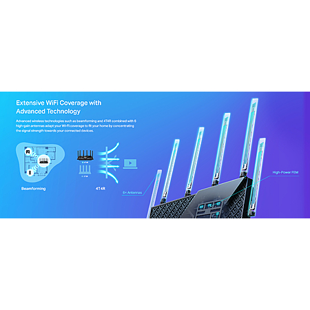 Extensive Coverage - Enjoy stable WiFi connections, even in the kitchen and bedroom. High-Power FEM, 6× Antennas, Beamforming, and 4T4R structures combine to adapt WiFi coverage to perfectly fit your home and concentrate signal strength towards your devices
