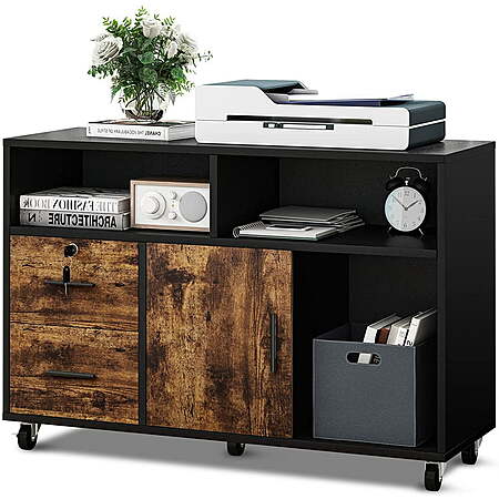 2-Drawer Dextrus Wood Mobile Lateral File Cabinet & Printer Stand w/ Open Storage Shelves (Black & Rustic Brown) $63.47