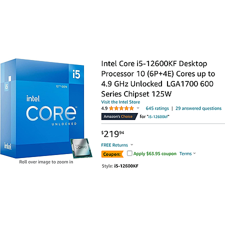 Amazon has Intel i5-12600KF Desktop Processor (BX8071512600KF) for $219.94 - $64.95 when you clip the coupon on the product page = $154.99. Shipping is free.