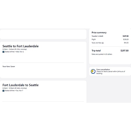 Alaska Airlines have round trip airfares travelling to and from Seattle (SEA) and Miami (MIA) or Ft Lauderdale (FLL) for $198, nonstop. These are saver fares, a restricted-type fare that will allow a personal item and a carry-on bag. There is no seat selection and no change.