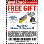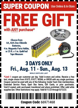Harbor Freight has select Gifts (24-Pack Zinc Chloride Batteries (AA or AAA), 4" Magnetic Parts Holder, or 25 ft. x 1 in. Quikfind Tape Measure for Free w/ Any Purchase valid through Sunday, 8/13. Purchase in-store to save on shipping, otherwise shipping is flat rate $6.99 for most orders.