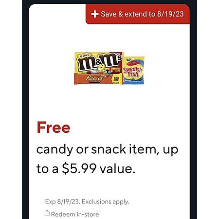 Valid in Staples® U.S. stores only on one candy or snack item, up to $5.99. Limit 1. Discount applied to highest priced eligible item. Coupon only available on the Staples Connect™ mobile app and must be presented at checkout. While supplies last. Limit one coupon per customer, nontransferable. Offer is subject to change or cancellation at any time. Not valid on Instacart orders, prior purchases or purchases made with Staples Advantage In-store Purchase Program. No cash/credit back. Coupon value applied pre-tax. Redeemed coupons cannot be made available for reuse. Expires 8/19/23.
