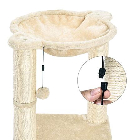 • 2 sturdy scratching posts, plush suspended hammock, secure base, and a replaceable dangling soft ball toy