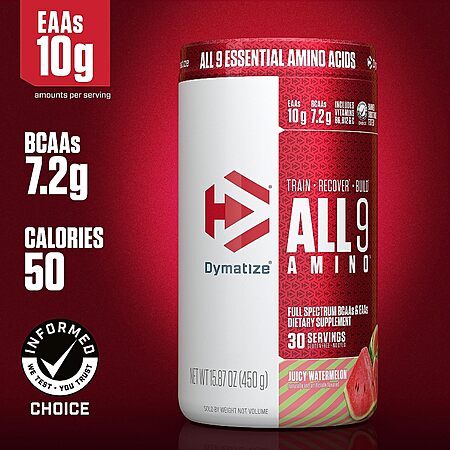 Model: Dymatize All9 Amino, 7.2g of BCAAs, 10g of Full Spectrum Essential Amino Acids Per Serving for Recovery and Optimal Muscle Protein Synthesis, Juicy Watermelon, 30 Servings, 15.87 Ounce