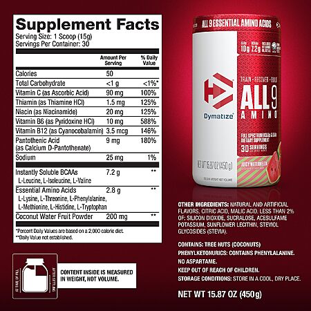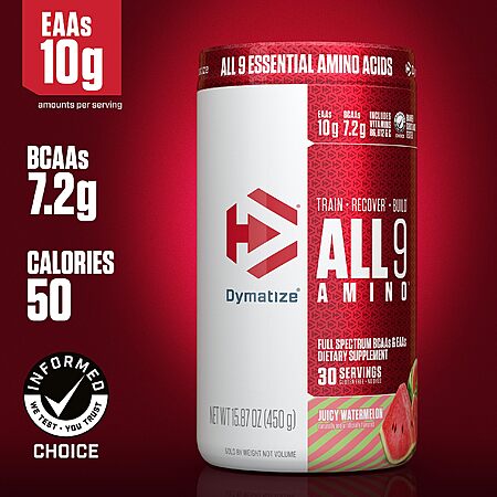 Model: Dymatize All9 Amino, 7.2g of BCAAs, 10g of Full Spectrum Essential Amino Acids Per Serving for Recovery and Optimal Muscle Protein Synthesis, Juicy Watermelon, 30 Servings, 15.87 Ounce