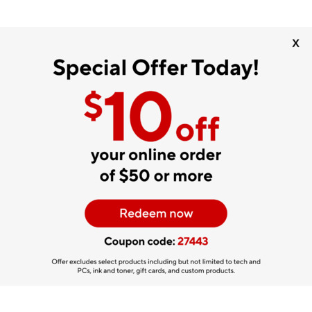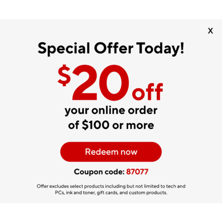 Staples $20 off $100 with code 87077, Aug 18 only, can stack with $10 off $50 with code 27443 if checkout order total is over $150. Exclusions apply.