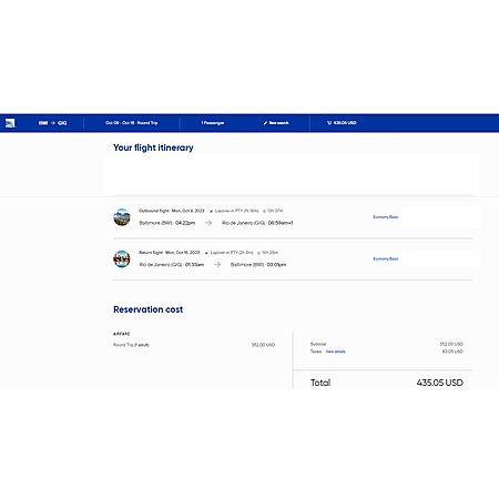 Star Alliance's COPA Airlines via Booking.com have round trip airfares travelling from Baltimore MD (BWI) to Rio de Janeiro (GIG) for $435, making 1 stop in Panama City. COPA Airlines is a low-cost air carrier so your low airfare will allow a personal item and a carry-on bag. There is no seat selection and no change.