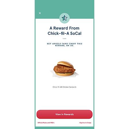 If you're located in the Greater LA-area in Southern California, log in to your Chick-fil-A app by 10:30AM PT, Sunday, August 20, 2023, with location detection on to automatically claim another free Chick-fil-A Original Chicken Sandwich, courtesy of the Los Angeles Angels scoring 7 or more runs at home. Once the reward is claimed, you will have until the end of Wednesday to redeem it.
