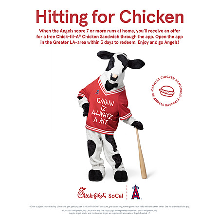 "At any home game, if the Angels score 7 or more runs, everyone will receive a free Chick-fil-A® Chicken Sandwich! Download or open the Chick-fil-A App® before 11:59pm on the night of the game to claim the reward (must have location services turned on and be within the Greater LA-area*). Redeem by scanning or placing a mobile order at a participating Chick-fil-A® restaurant within 3 business days."