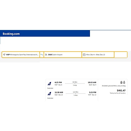 Icelandair via Booking.com have round trip airfares travelling from Minneapolis (MSP) to Dublin Ireland (DUB) for $462, making 1 stop in Iceland. These are economy light fares, which is much like basic economy. You do get 1 personal item and 1 carry-on bag. There is no seat selection and no change.
