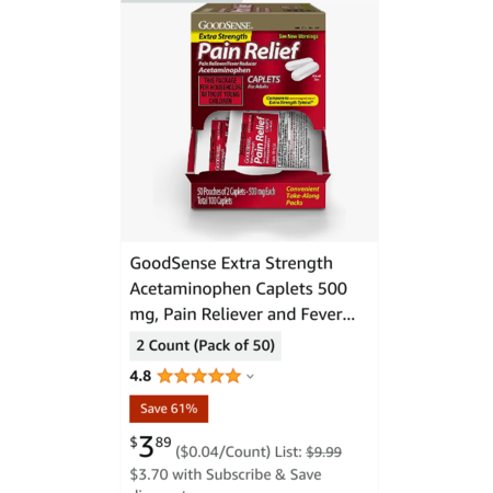100 ct. (2ct. Pack of 50 Packets) GoodSense Extra Strength Acetaminophen Caplets 500 mg $3.51 + Free Shipping w/ Prime or on $25+
