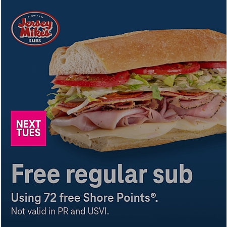• Jersey Mike's: Regular Sub for Free (after using 72 Shore Points added to your account within 24 hours)